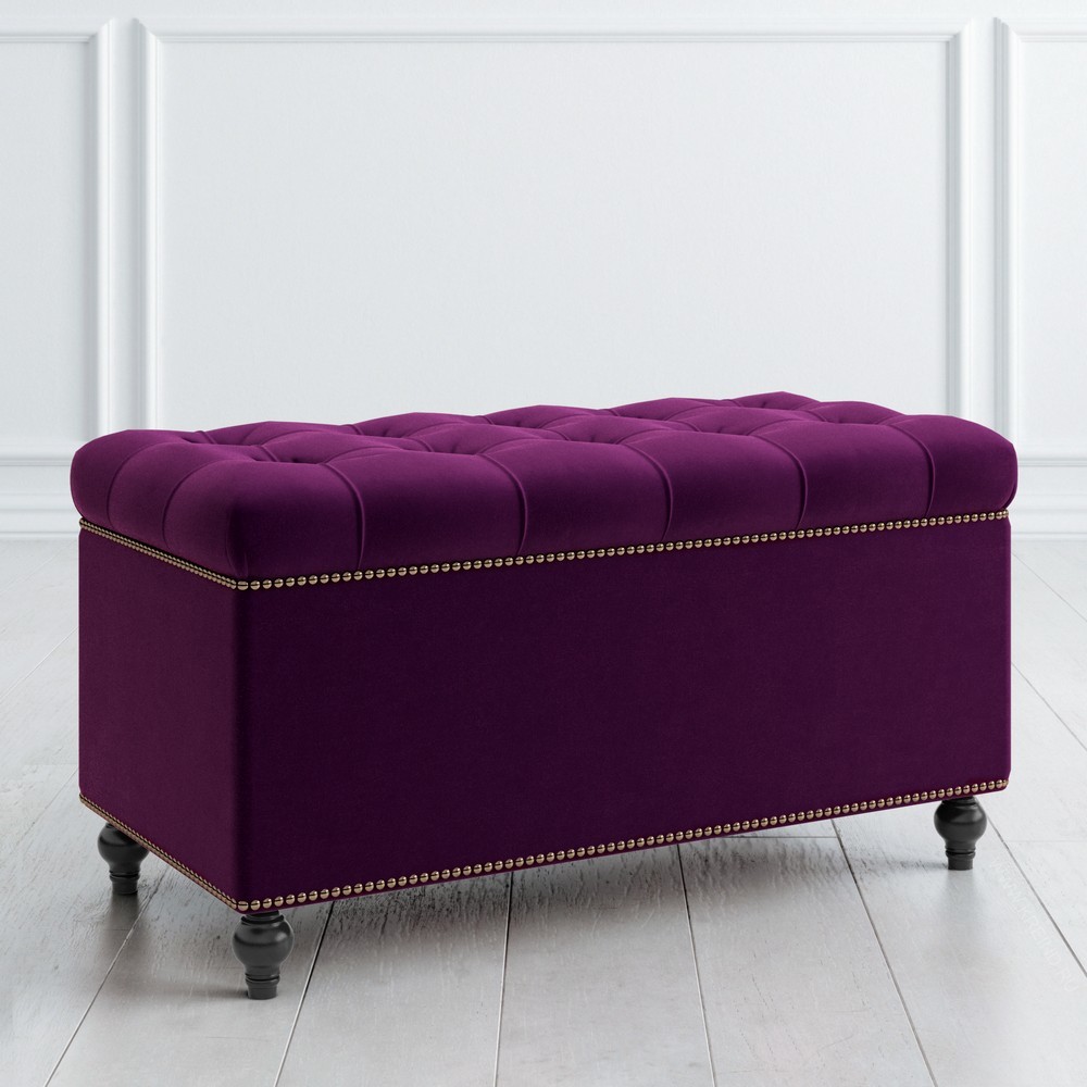 Открывающийся сундук с обивкой из насыщенного сиреневого цвета станет отличным решением для просторной прихожей, уютной гостиной или спальни. Строгие ровные линии корпуса отлично гармонируют с изящными ножками из натурального дерева. Использование техники обивки с утяжкой придает сиденью эффектный внешний вид. Завершает образ оригинальный декор по периметру корпуса. Сборка не требуется.
