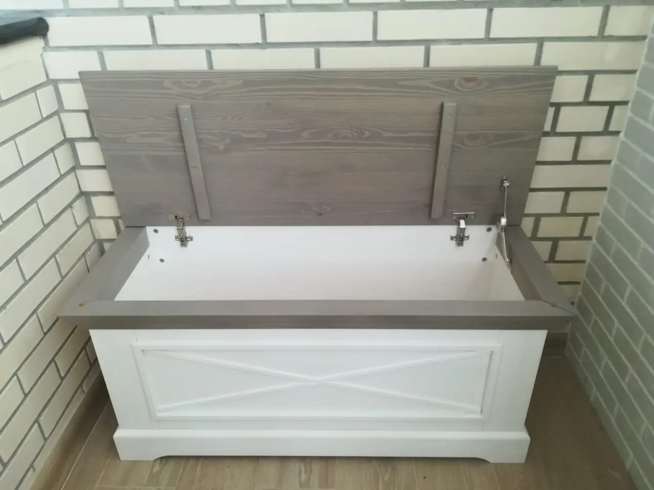 Поставляется в цвете – «белый воск/серый (антрацит)». Комбинация цвета подразумевает отделку крышки сундука в цвет «антрацит» (серый), остальная часть изделия в цвете «белый воск». Структура дерева слегка просвечивает.