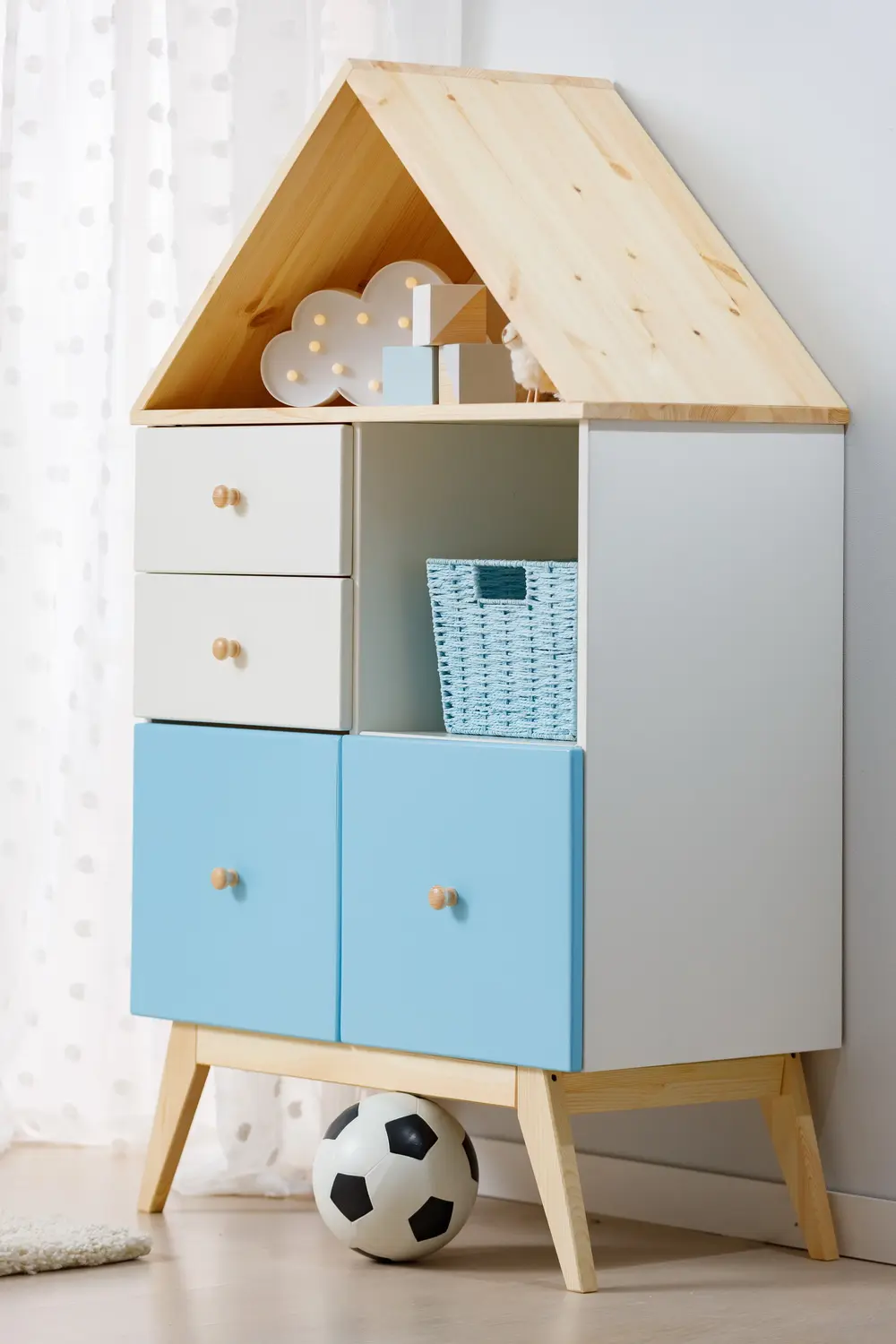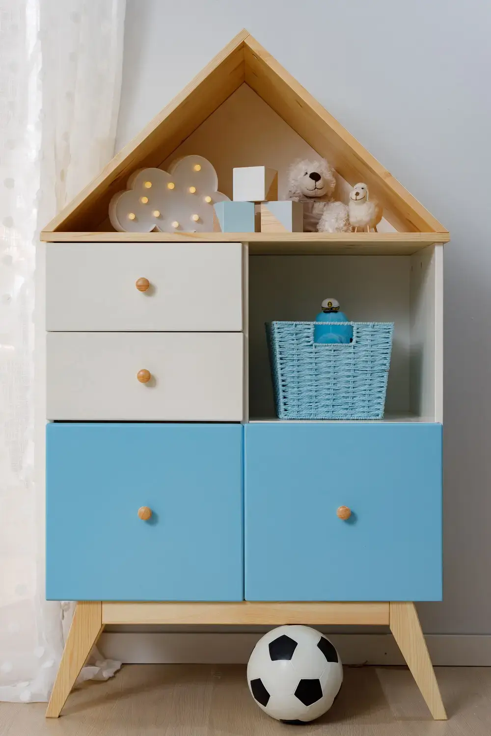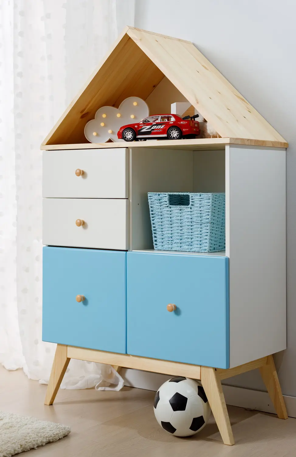 Цвет комода на титульной фотографии - эмаль белая/бесцветный лак - крышка, ручки, ножки/голубая кидс - нижние фасады. Стоимость зависит от выбранного покрытия. При заказе мебели в составном цвете цена считается по более дорогому (в данном примере по цвету "голубая кидс").
