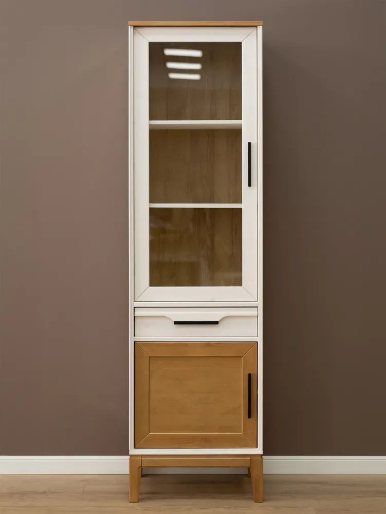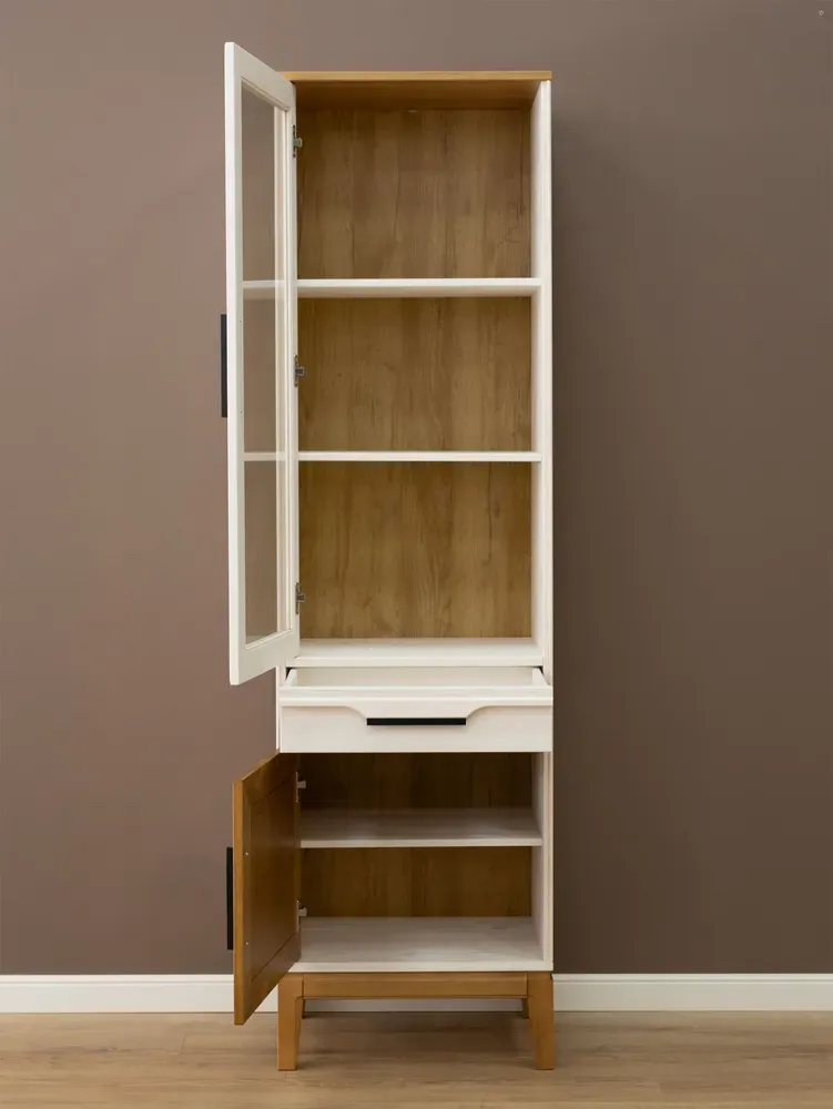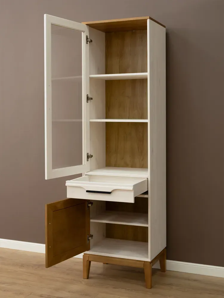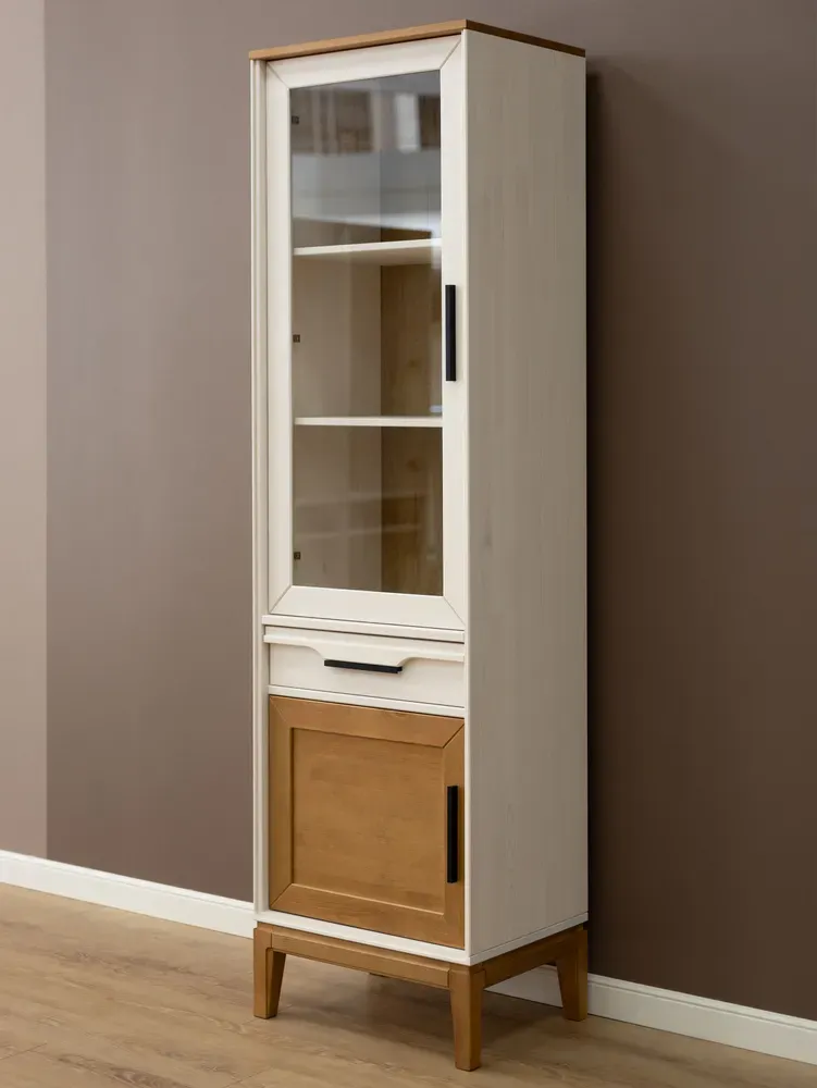 Шкаф имеет основание с высокими крепкими ножками, которые обеспечивают ему устойчивость. Кроме того, шкаф не нужно сдвигать во время уборки: под ним остается достаточно пространства, в том числе для уборки роботом-пылесосом. За остекленной дверцей расположены полки, на которых можно хранить посуду или сувениры. На дверцах и ящике чёрные профильные ручки.