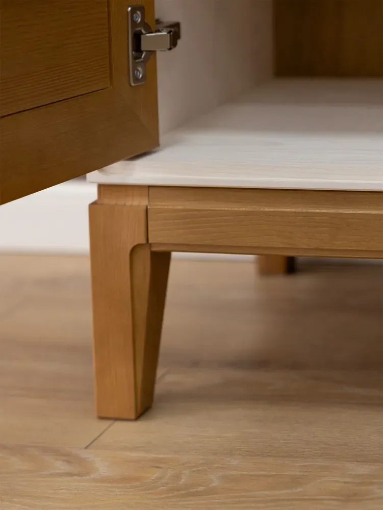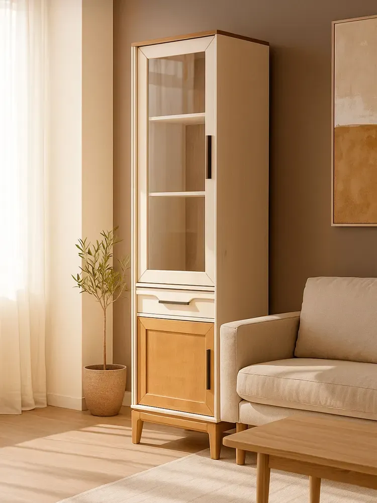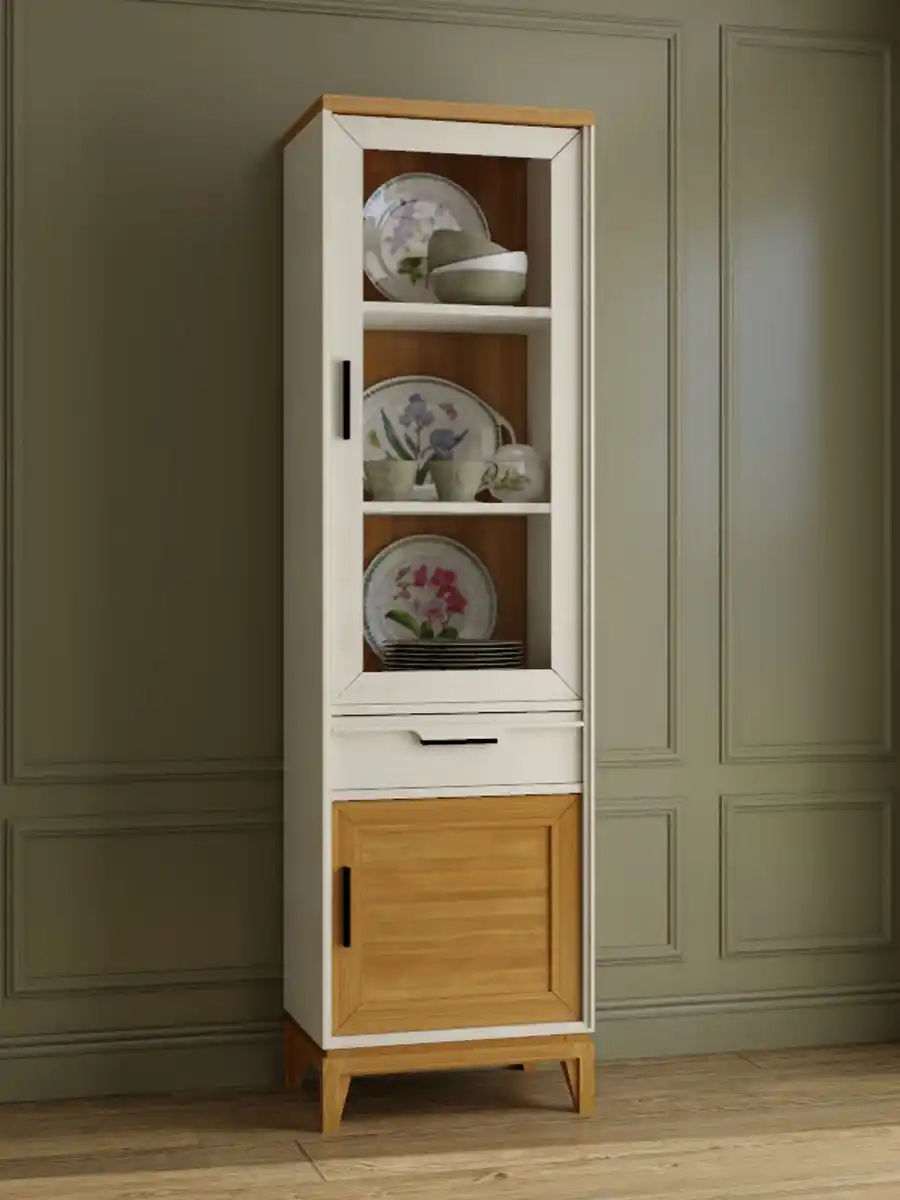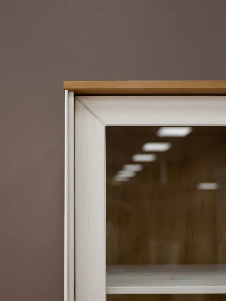 Шкаф имеет основание с высокими крепкими ножками, которые обеспечивают ему устойчивость. Кроме того, шкаф не нужно сдвигать во время уборки: под ним остается достаточно пространства, в том числе для уборки роботом-пылесосом. За остекленной дверцей расположены полки, на которых можно хранить посуду или сувениры. На дверцах и ящике чёрные профильные ручки.