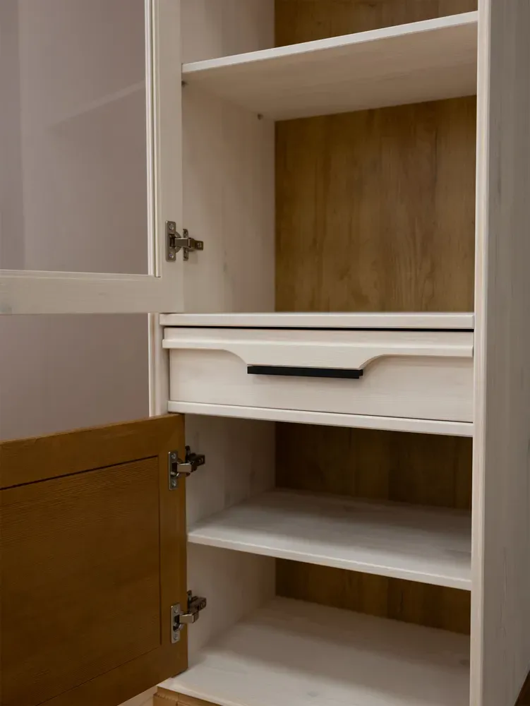 Крышка, нижняя дверца и основание окрашены в цвет «антик», остальные части изделия – в цвете «белый воск». Через покрытие цвета антик видна природная текстура сосны. Вы можете купить этот же шкаф для посуды в отделке «серый/антик». Он будет естественно смотреться не только на кухне, но и в гостиной. При этом он совместим с предметами в разных стилях: скандинавском, классическом, винтажном, кантри.