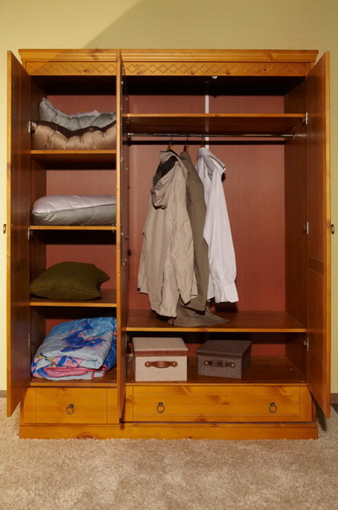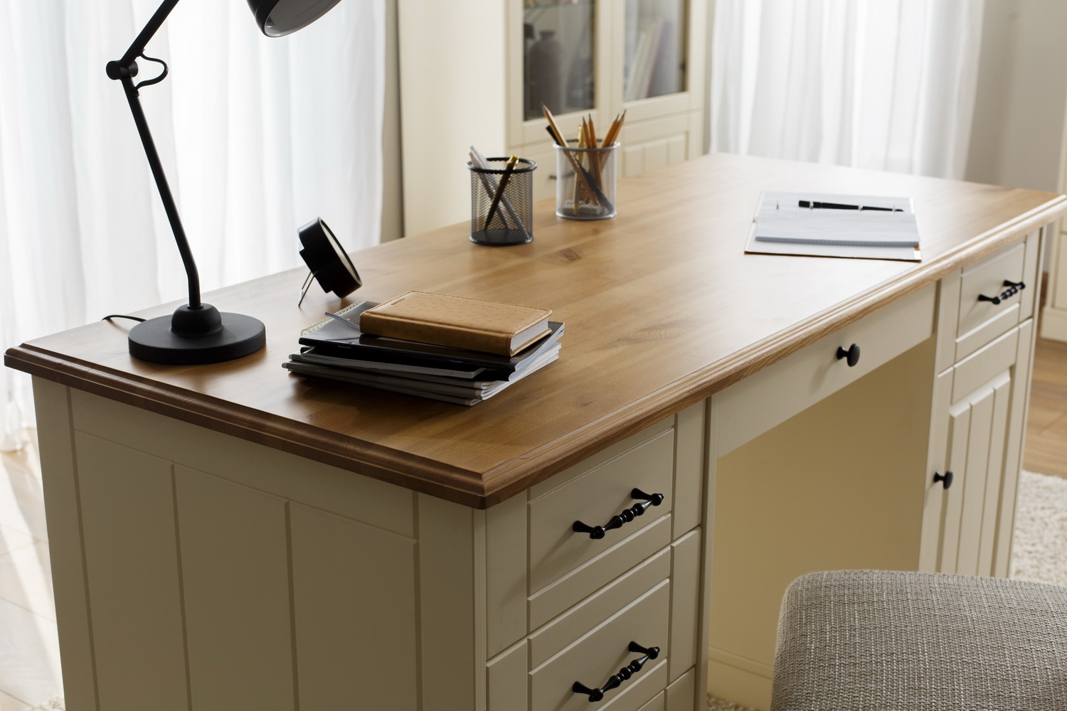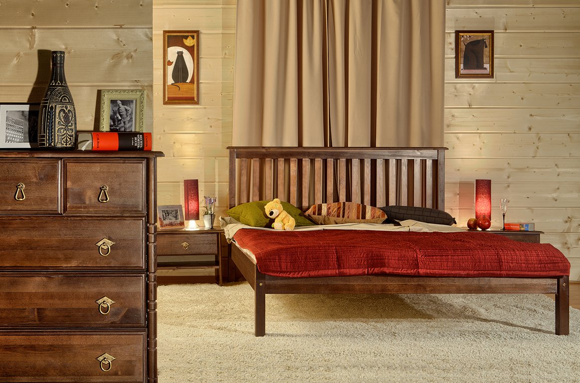 Мебель «Дания» изготавливается из массива сосны. После тонировки под покрытием остается видна естественная древесная текстура, включая сучки. По запросу корпус и фасады могут быть изготовлены из МДФ, без сучков. Задние стенки изделий и донья ящиков выполняются из ДВП. Ящики устанавливаются на шариковых направляющих с полным выдвижением, без доводчиков.
