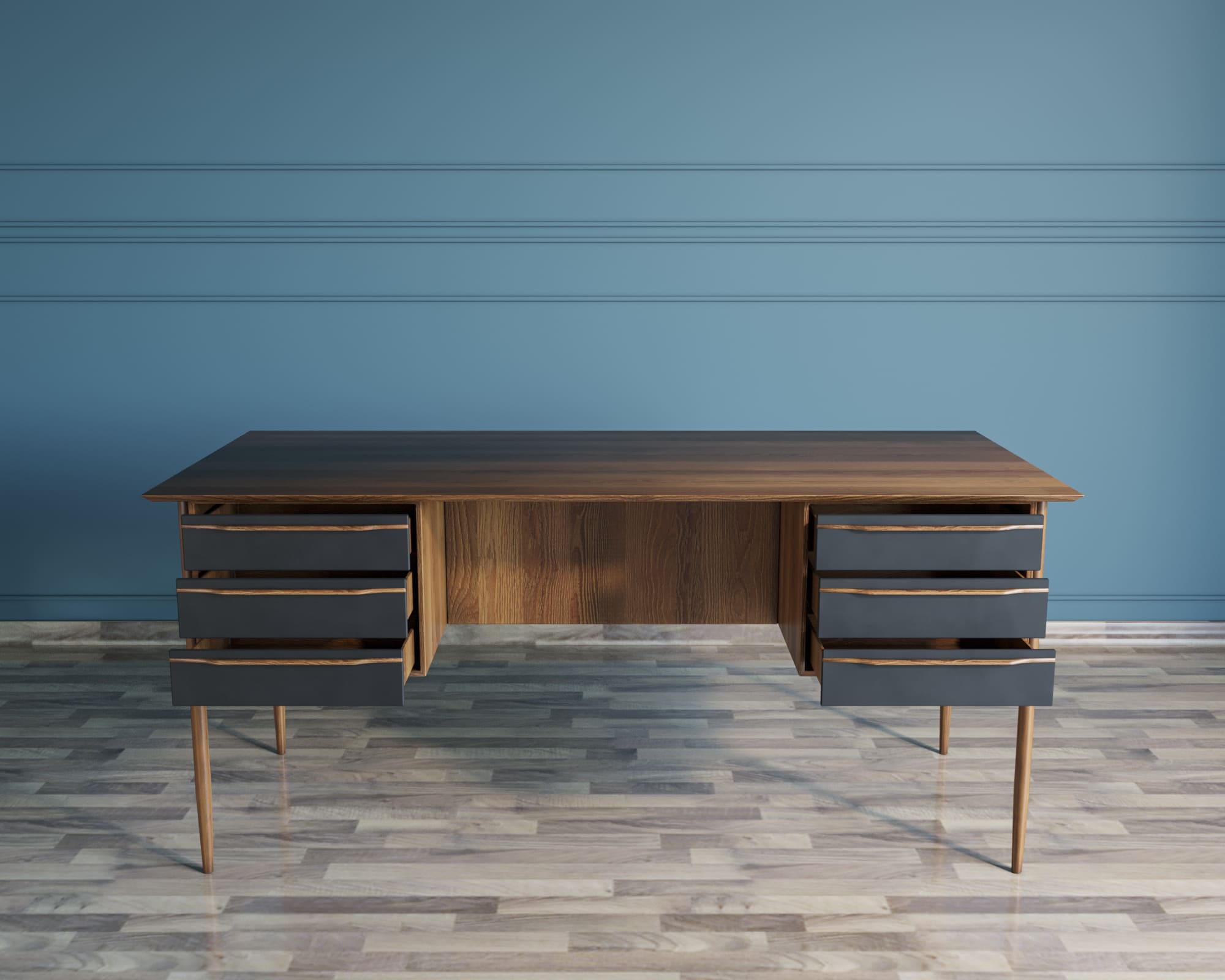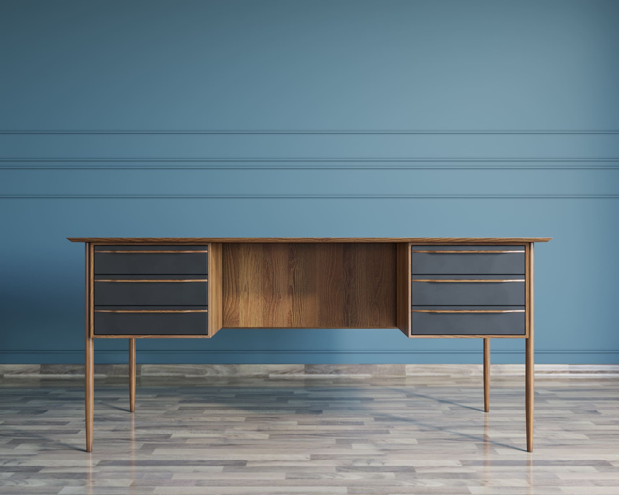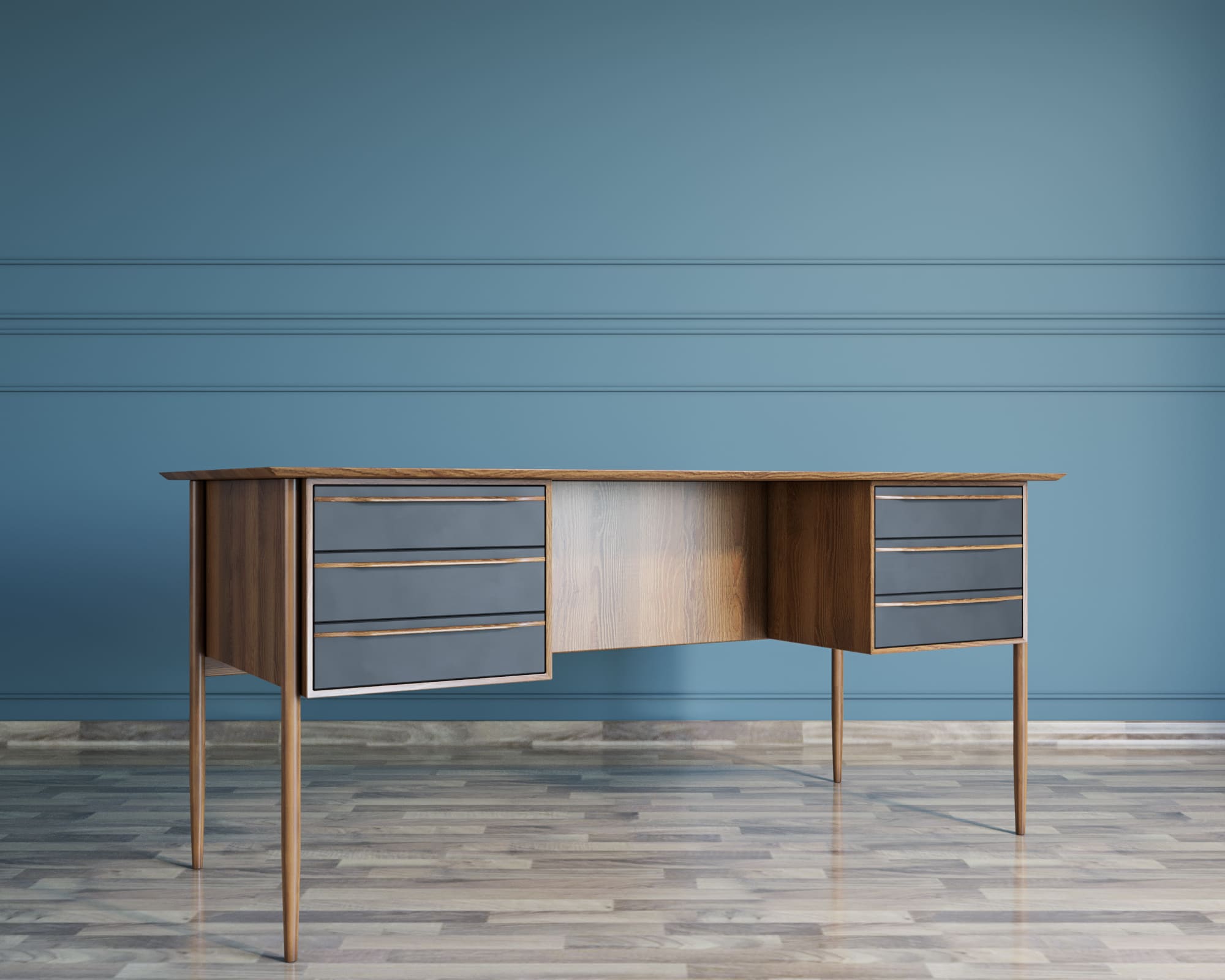 Рабочий письменный стол с ящиками. Скандинавский стиль характерен простотой, минимализмом и функциональностью.