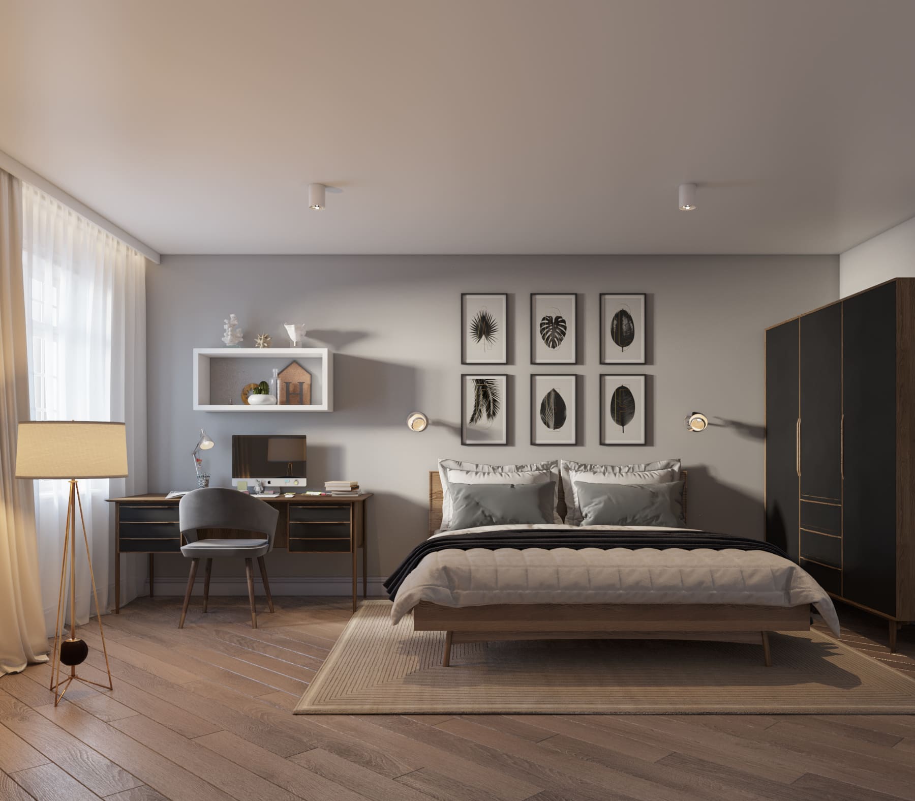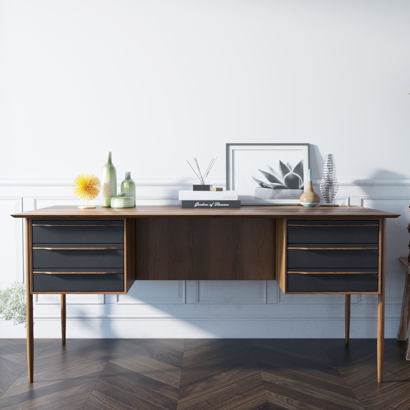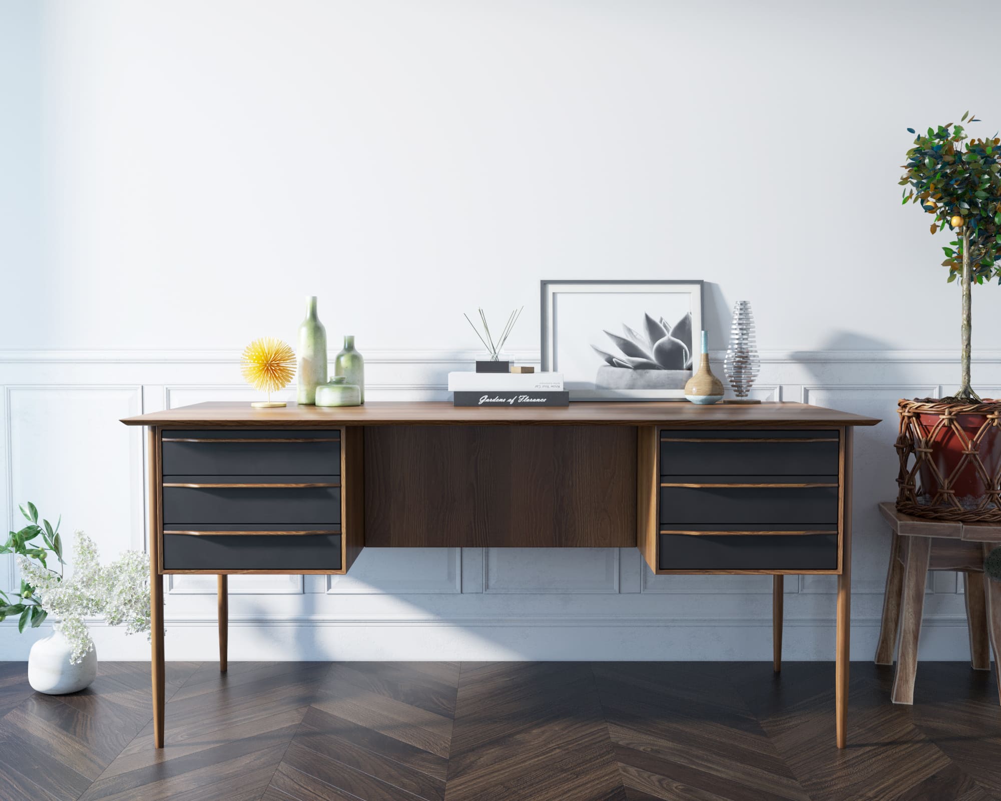 Рабочий письменный стол с ящиками. Скандинавский стиль характерен простотой, минимализмом и функциональностью.