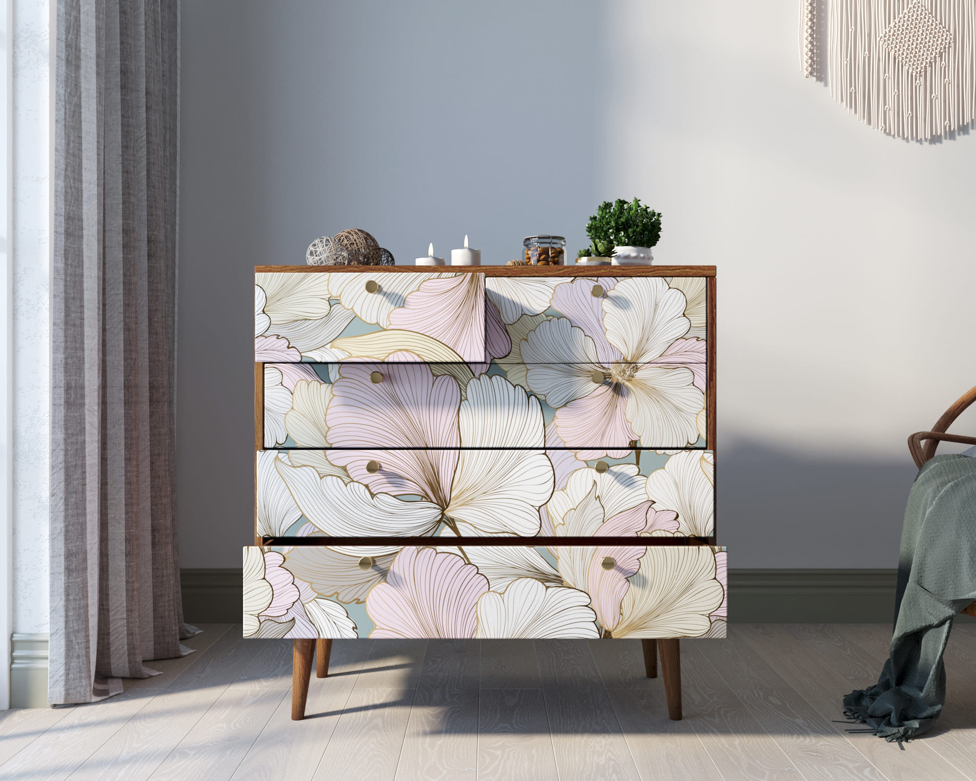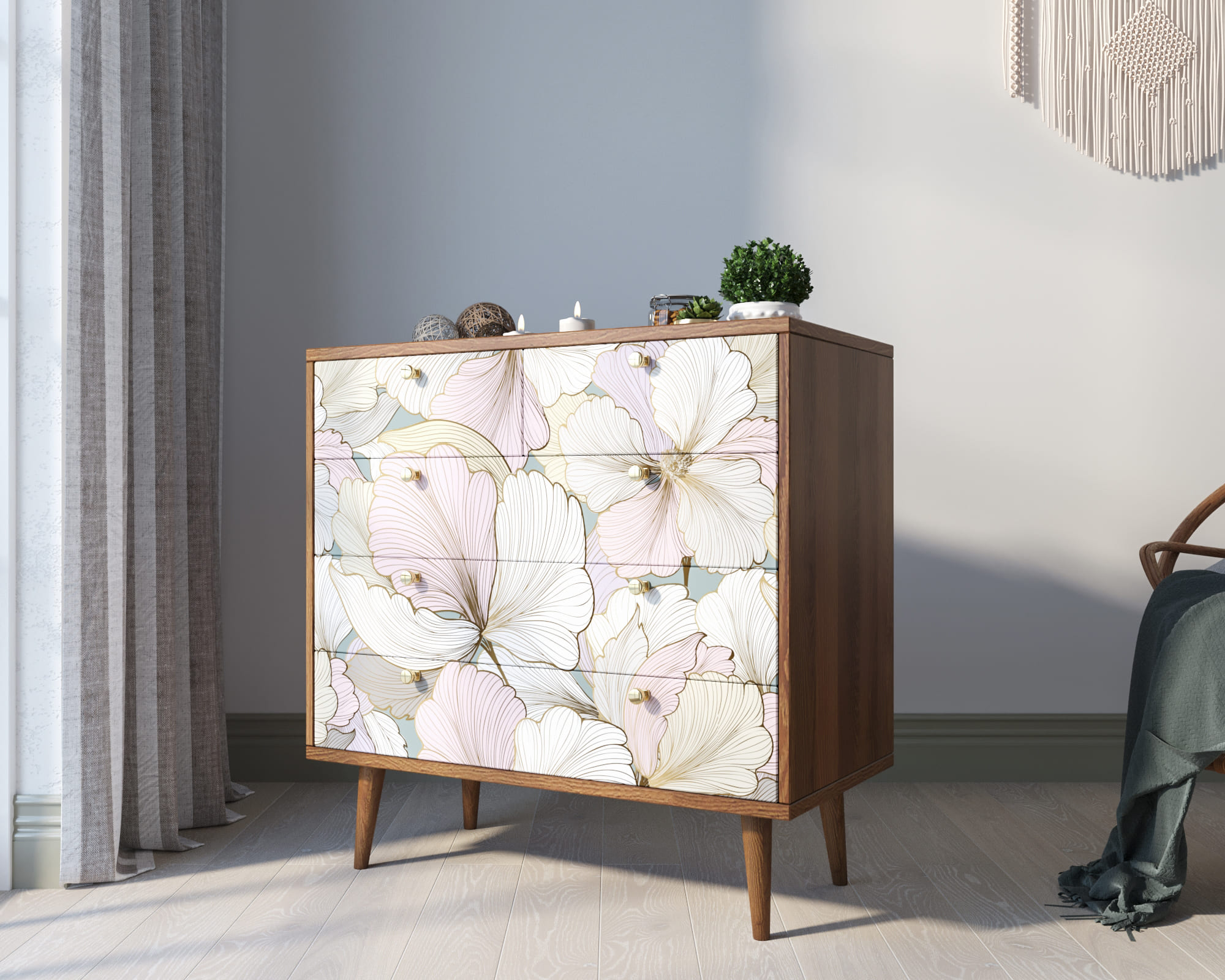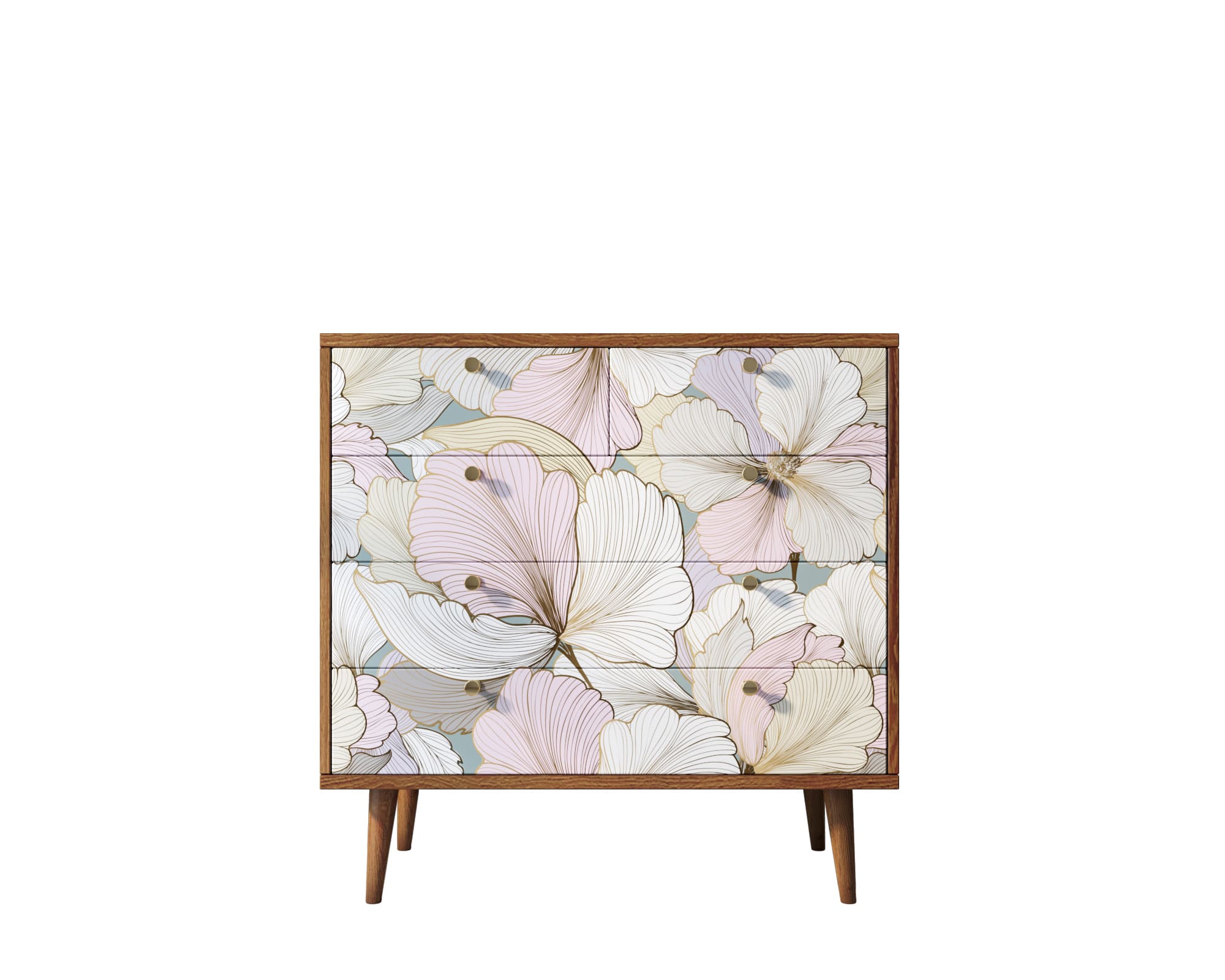 Корпус и ящики изготавливаются из ЛДСП австрийской компании "EGGER". Ножки мы делаем из массива ясеня и крепим на стальную пластину, на дверях петли с доводчиком а на ящиках шариковые направляющие. Принт на фасады наносится принтером специальными УФ - чернилами.
