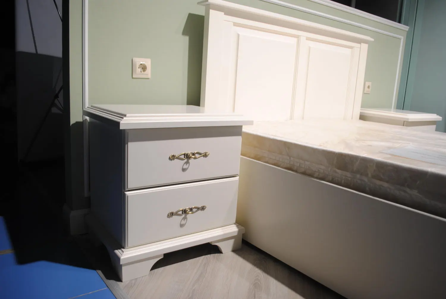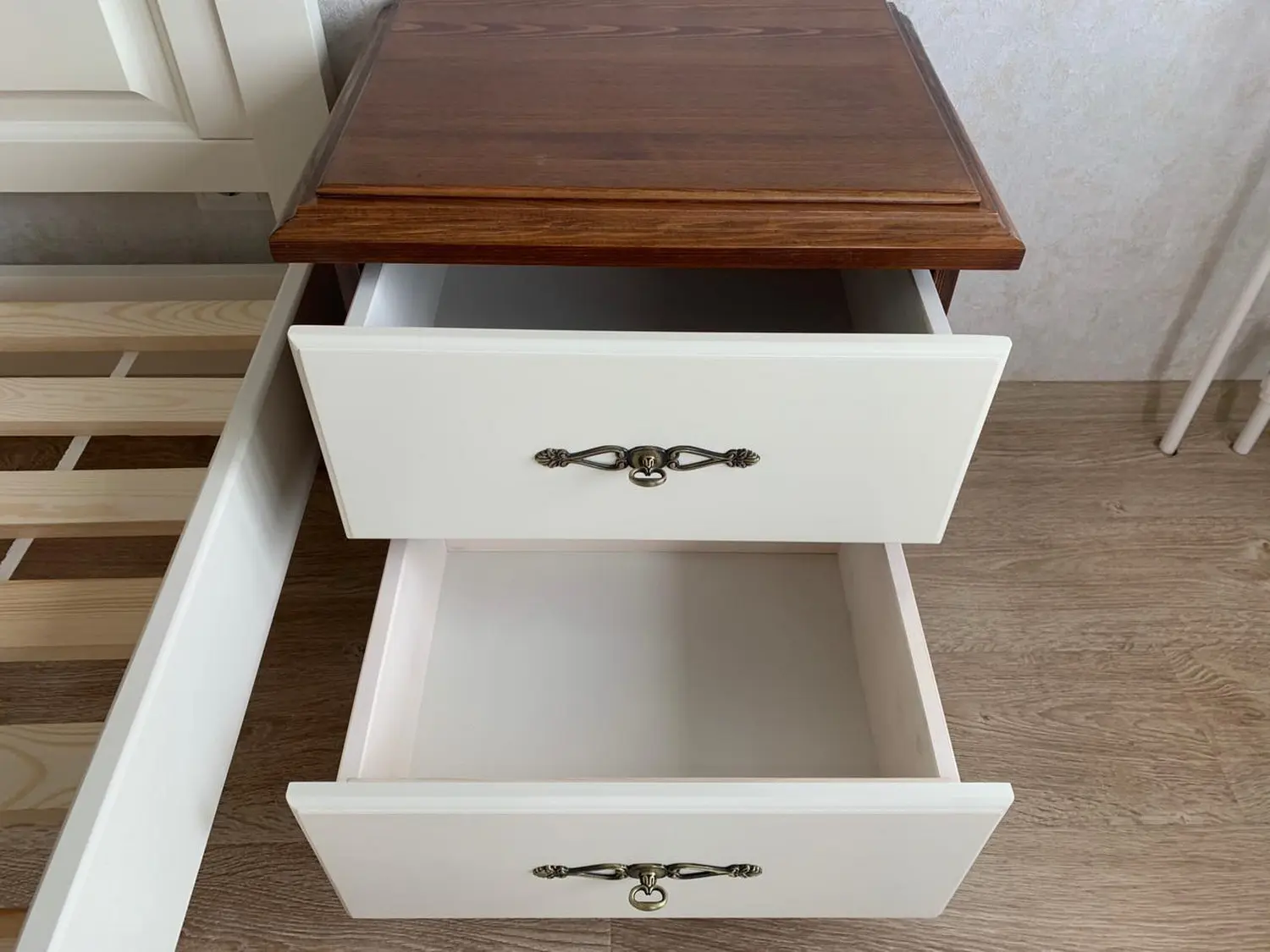 Прикроватная тумба Брусно, выполненная из массива сосны, содержит два выдвижных ящика на направляющих скрытого монтажа с доводчиками, обеспечивающих плавное выдвижение.
